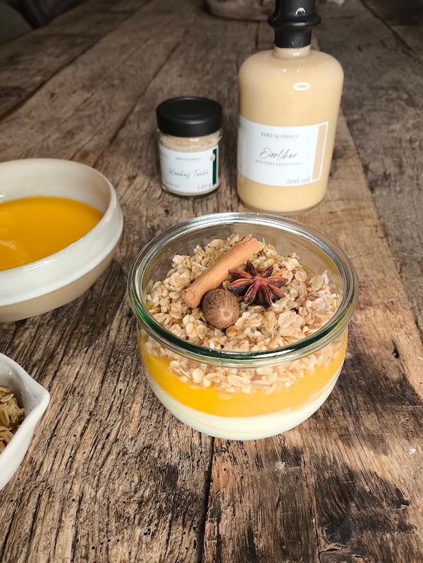 Für die Creme den Joghurt mit dem Eierlikör alla Omas Käsekuchen verteilen und diesen in Gläser oder eine Schüssel füllen. Die Pfirsiche abtropfen lassen, pürieren und über dem Joghurt verteilen.